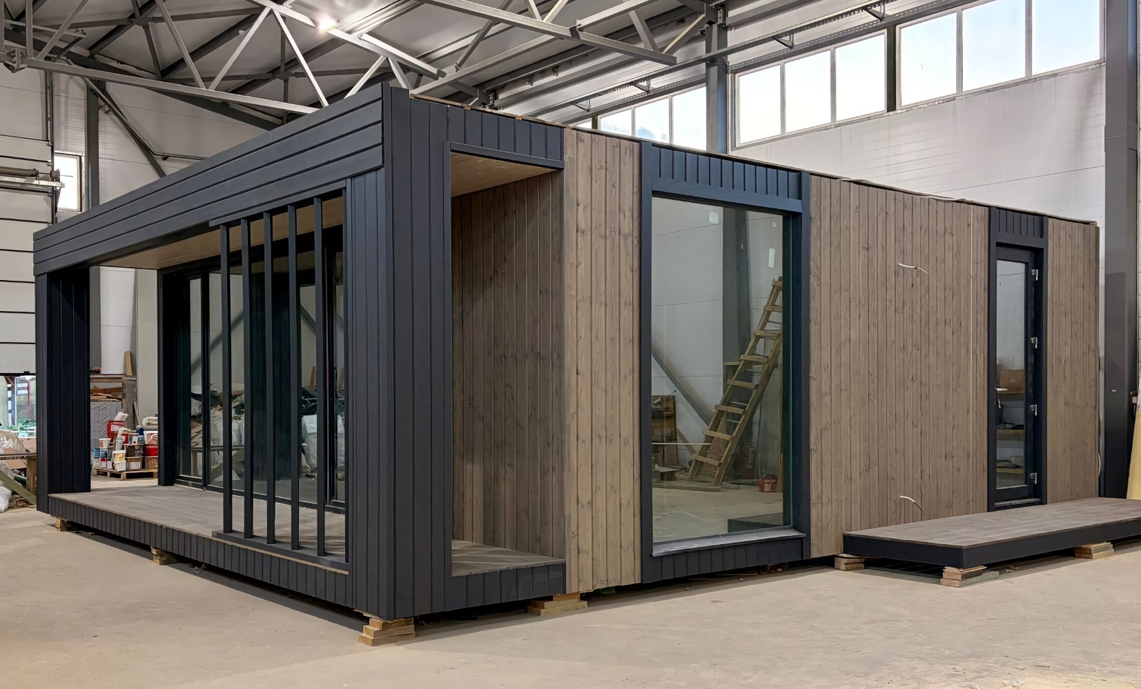 Максимальная готовность дома 99% на производстве, комплектация с полной отделкой внутри и снаружи, всеми системами, кровлей, остеклением, бойлером, теплыми полами, сантехникой, умным домом и дополнительно мебелью.