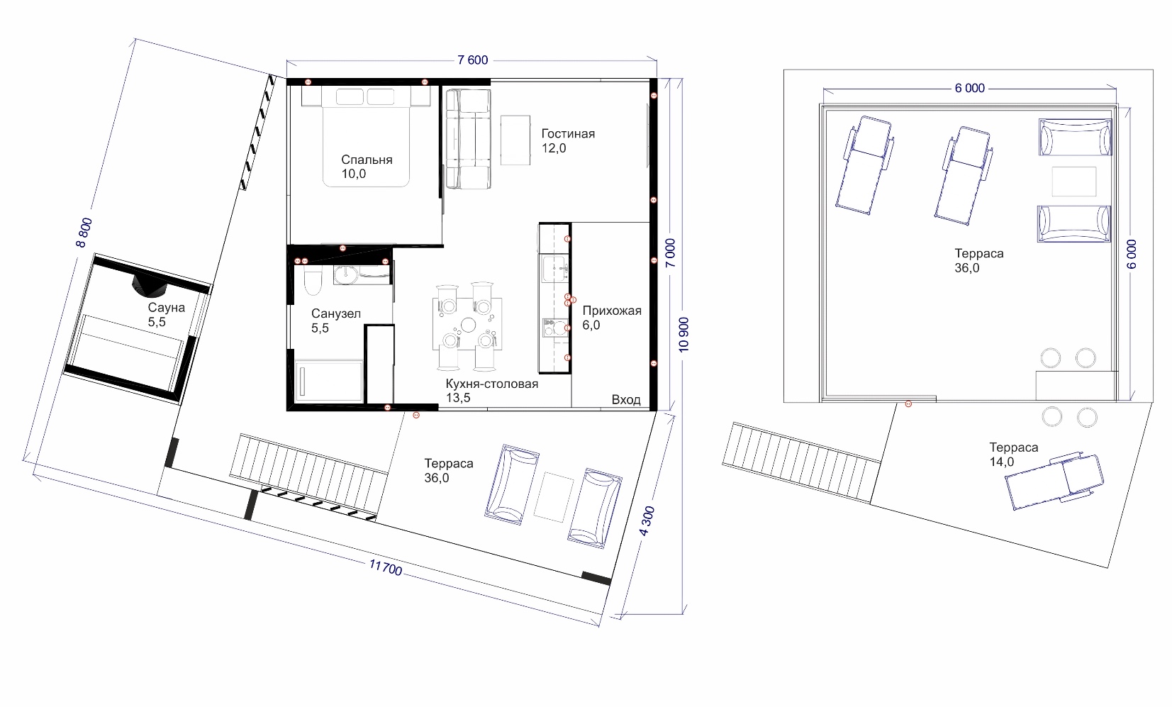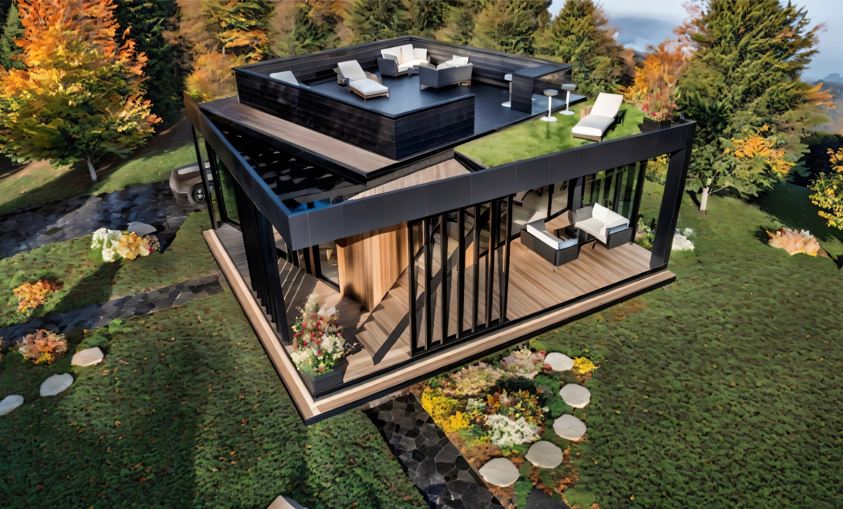 Для расширения функционала предлагаем несколько стилей террас: терраса на крыше и дополнительный модуль сауны.