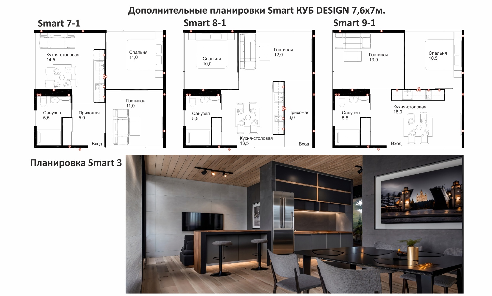 где комфорт встречается с инновациями! Это новое поколение наших модульных домов. Мыразработали инновационный принцип создания проекта модульного дома: от простых форм до хай-тека. В основе — базовые дома размером 7х7,6м и 10,6-7,6м с санузлом 5,5м2 и свободным пространством 41,5м2 и 65,5м2.