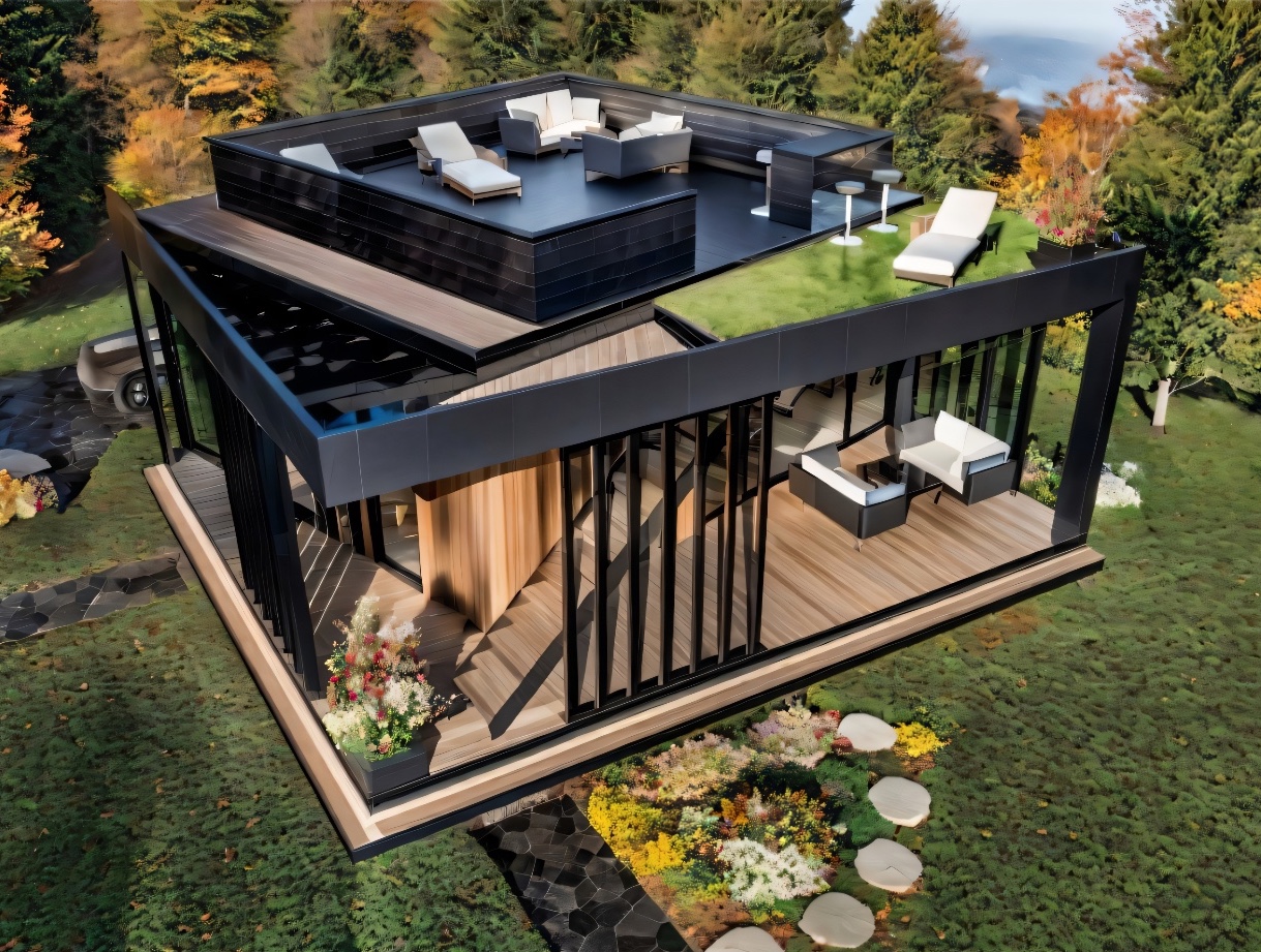Для расширения функционала предлагаем несколько стилей террас: терраса на крыше и дополнительный модуль сауны.Идеальное решение для людей, ценящих технологии, энергоэффективность и комфорт.